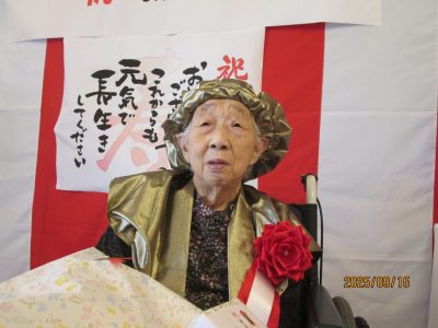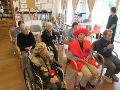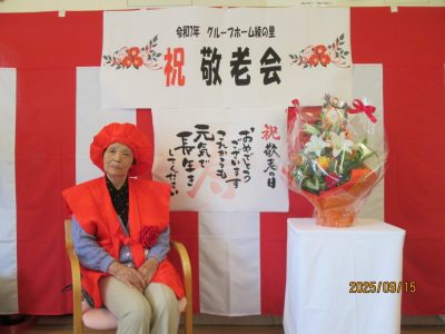 9月15日、グループホームにて敬老会を開催しました。普段のリビングに紅白幕を張り、ほんの少し緊張&照れ臭い記念撮影となりました。
