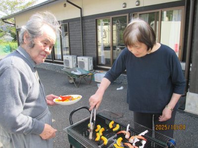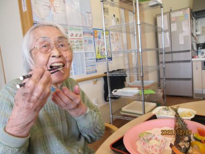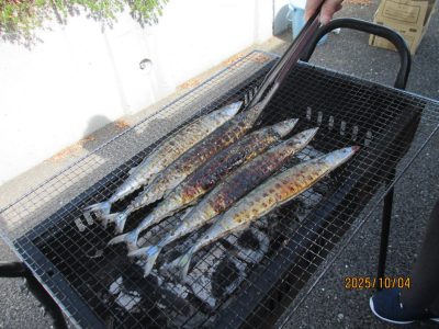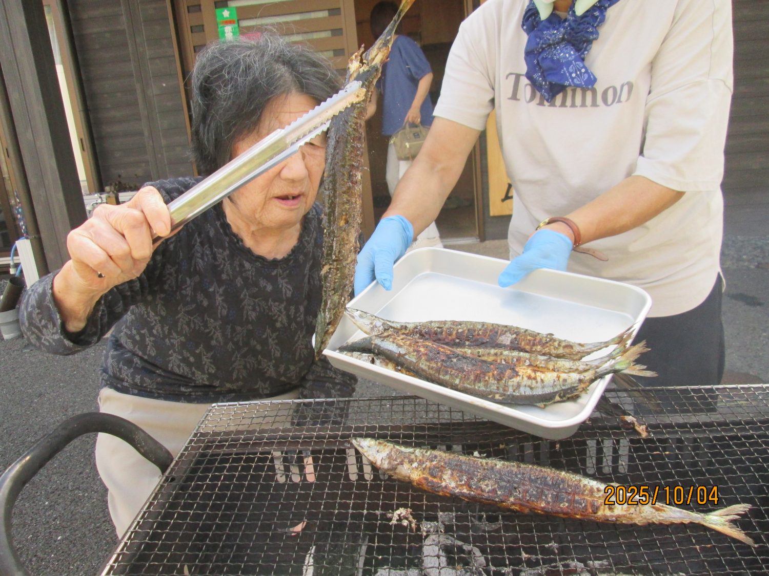 10月3日は秋晴れの中、園庭でBBQです。さんまの焼き加減を見るのは職員より上手…!さんまの他に海老、椎茸、南瓜、パプリカを焼き、お昼に豚汁&おにぎりとともに提供しました。今年のさんまは大振りと言われていますが、皆さんまるまる一匹たいらげていらっしゃいました。