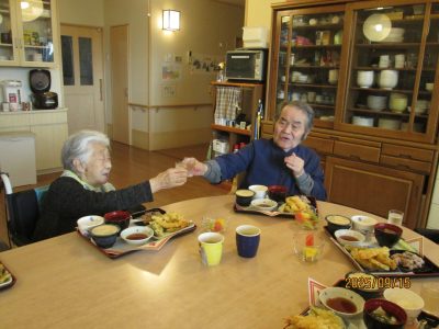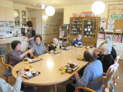 今年は最高齢96歳の方と米寿の方に記念品を贈呈し、他の入居者の皆様にもお祝いの品と豪華なお祝い御前を用意させていただきました。ノンアルコールではありますが梅酒で乾杯です!