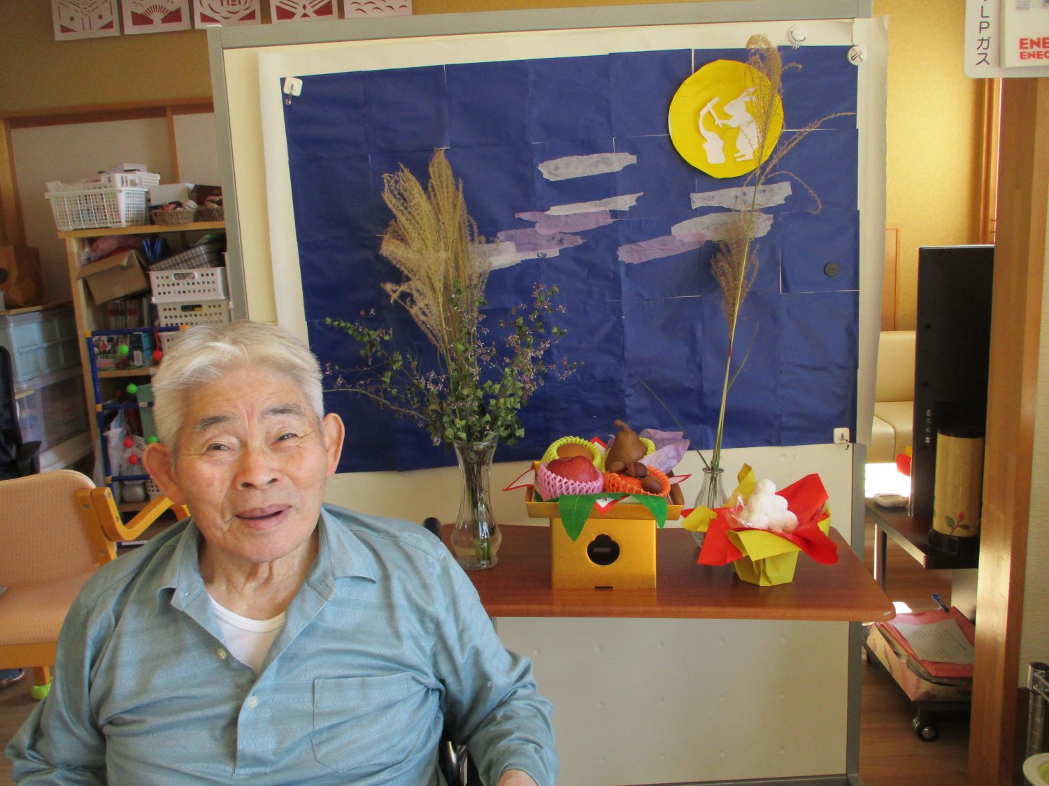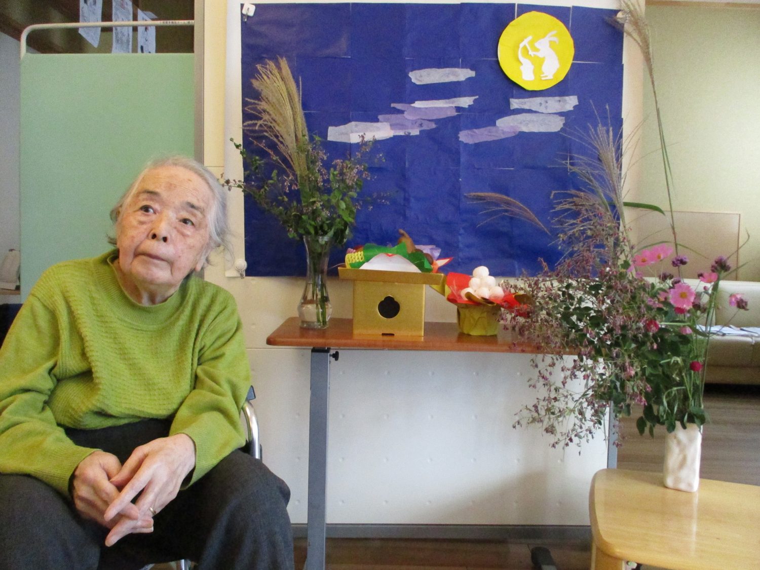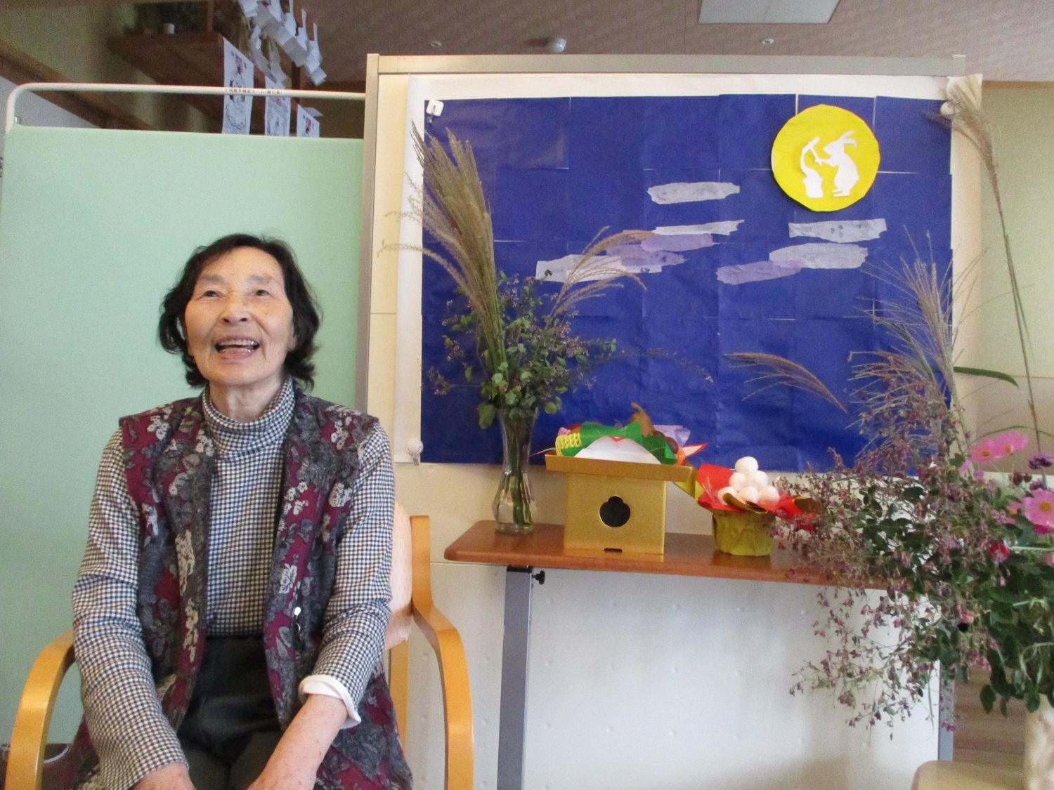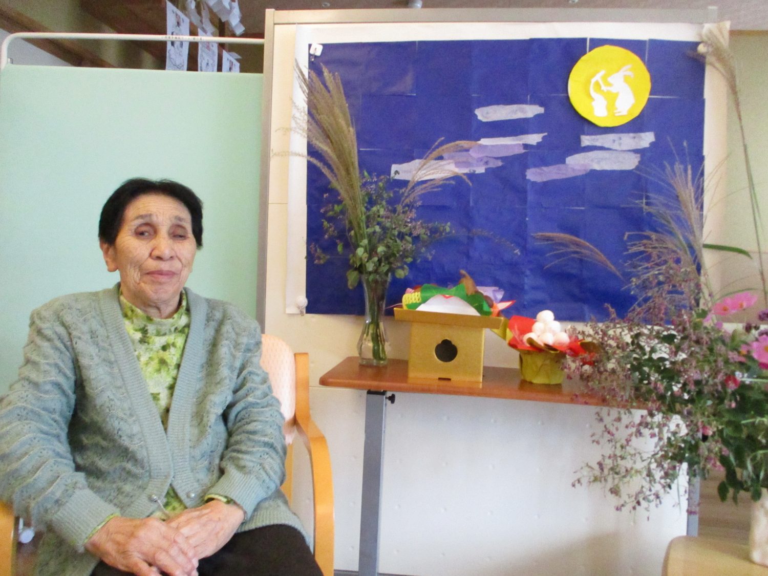 小規模(綾の里)では皆様に十五夜を楽しんでいただきたく、みんなで十五夜の夜を作成しました。近くに咲いていたハギとススキを収穫し、少しでも理想に近い満月の風景を考え、十五夜の壁紙を作成しました。