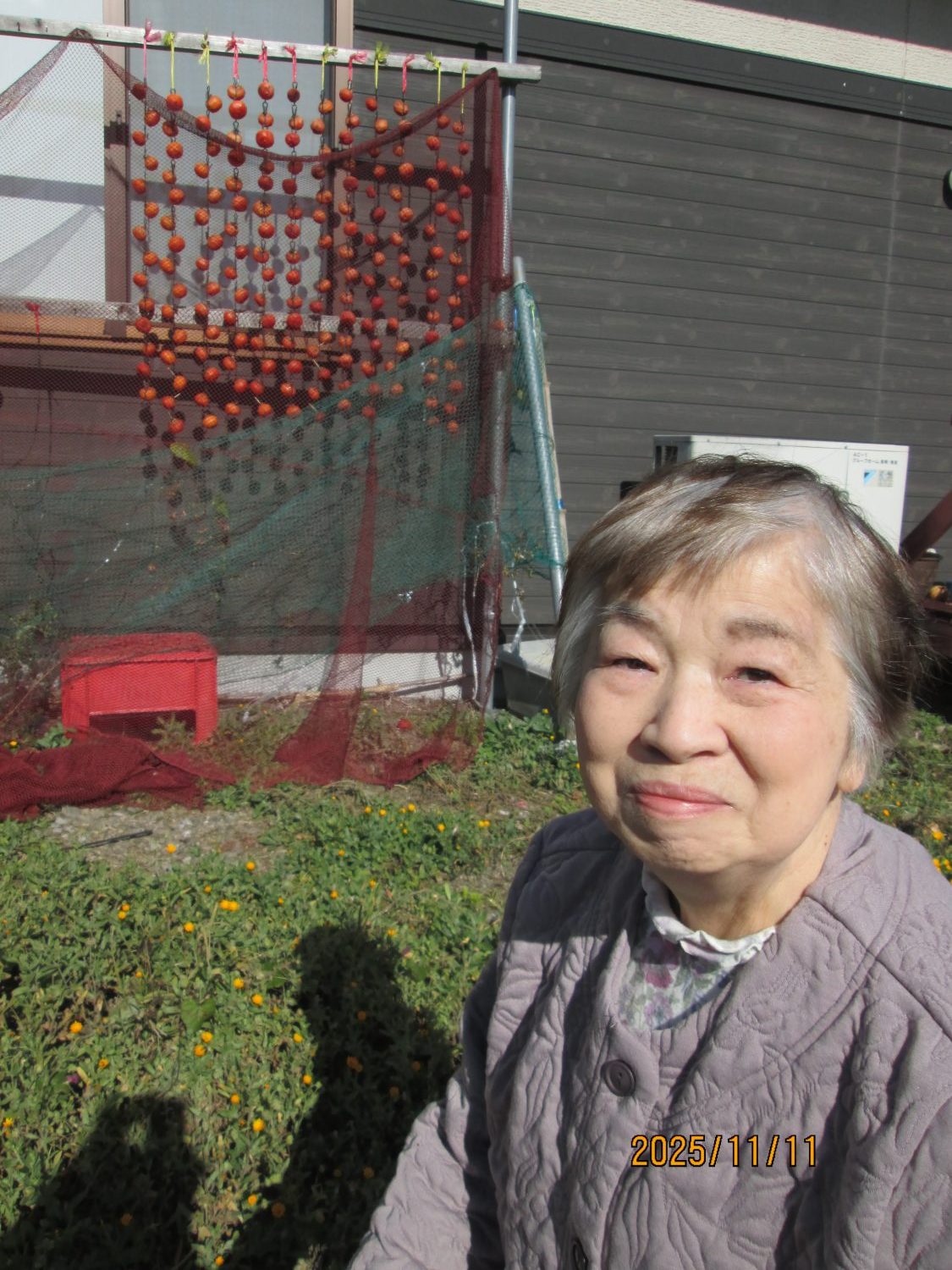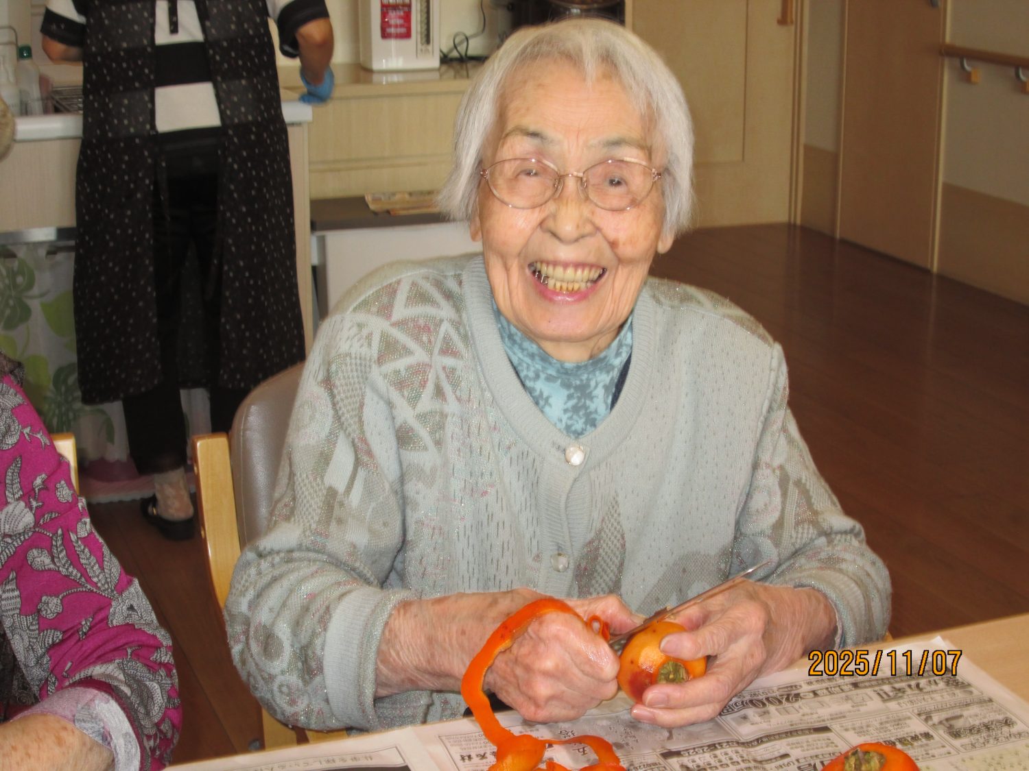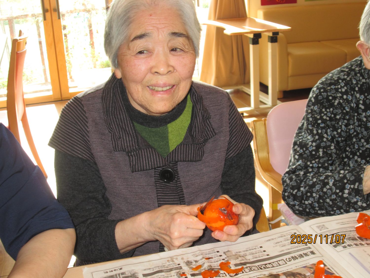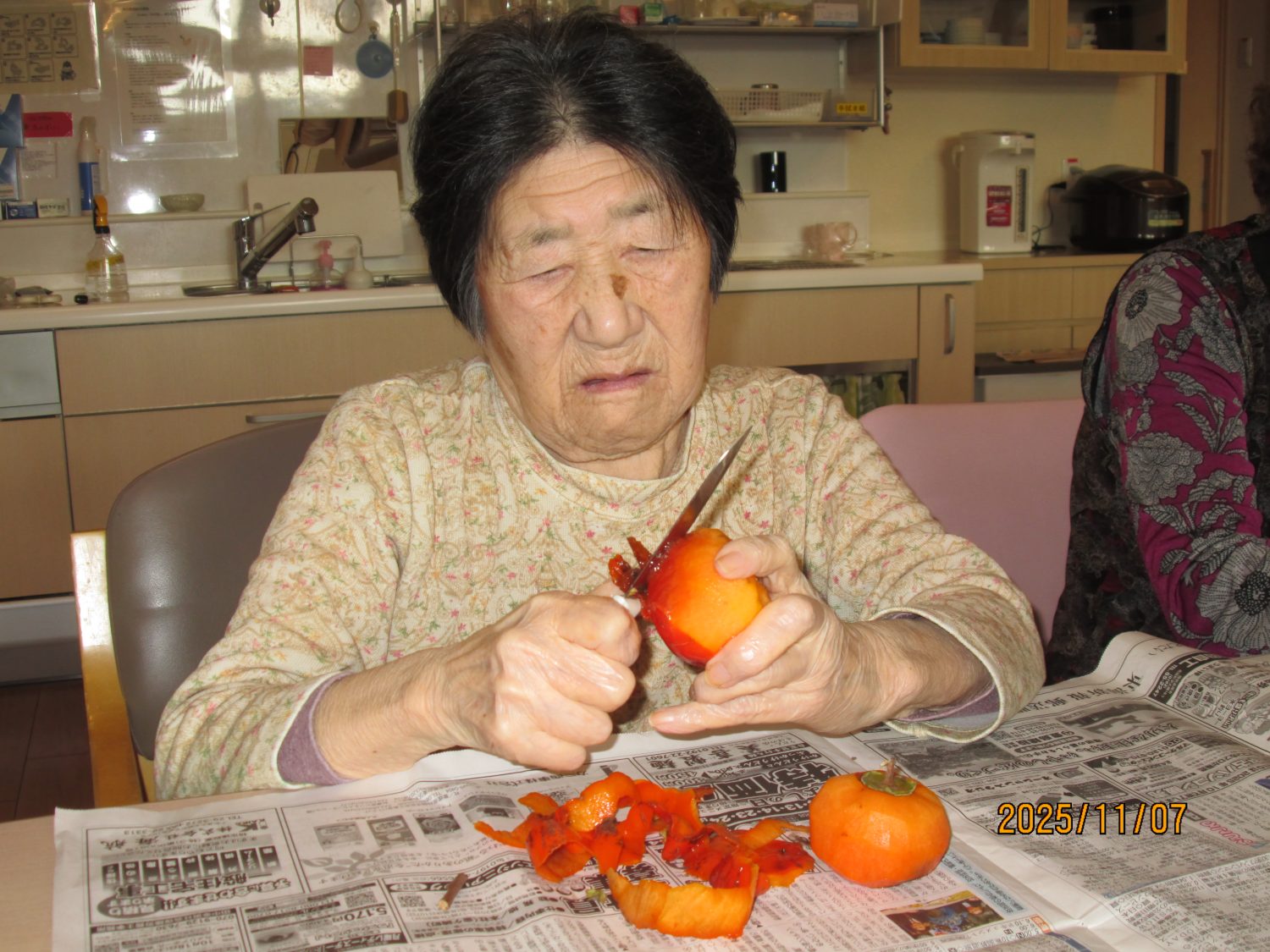 干し柿づくりでは、毎年大量の柿が入居者の皆さんの手によってあっという間に剥かれていき、今年も見事な柿暖簾が完成しました。