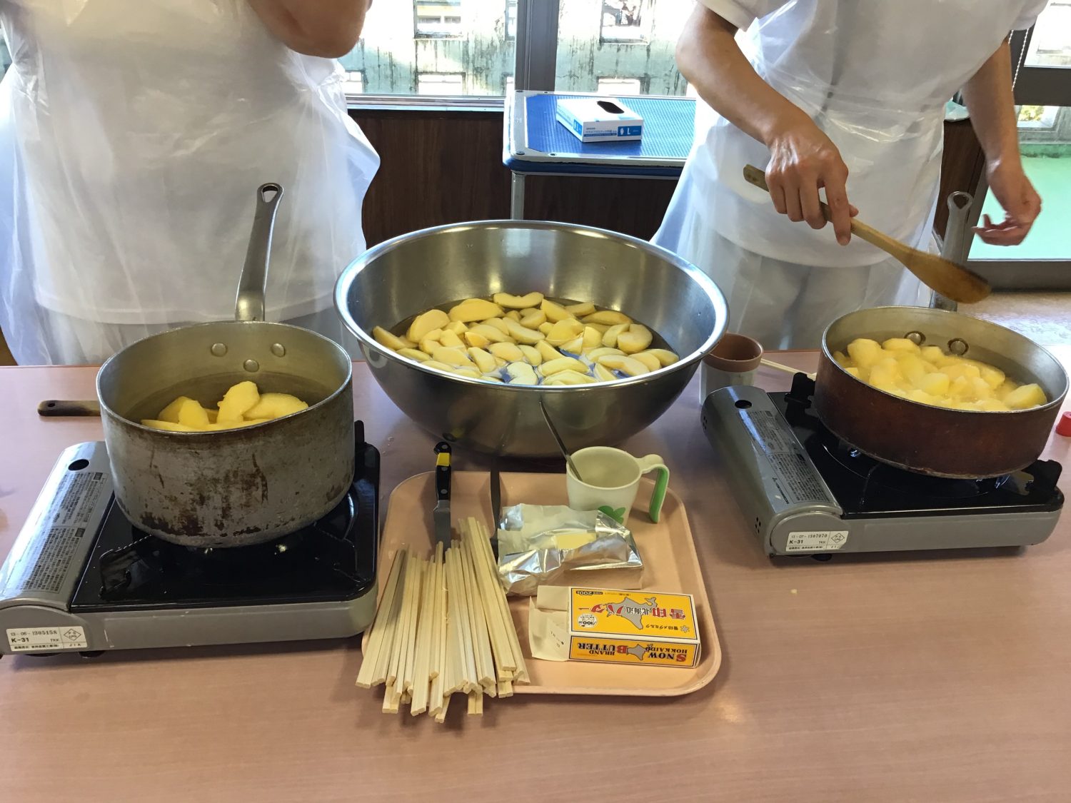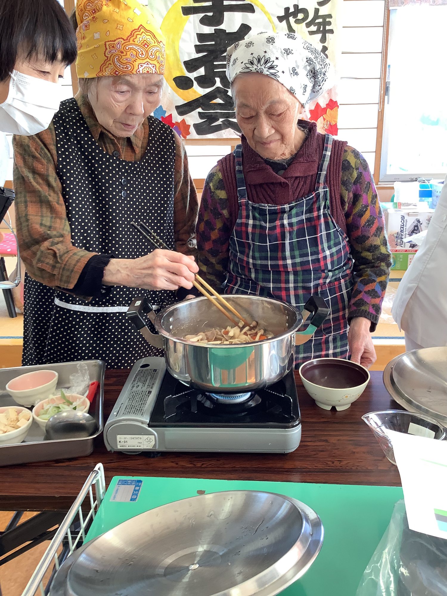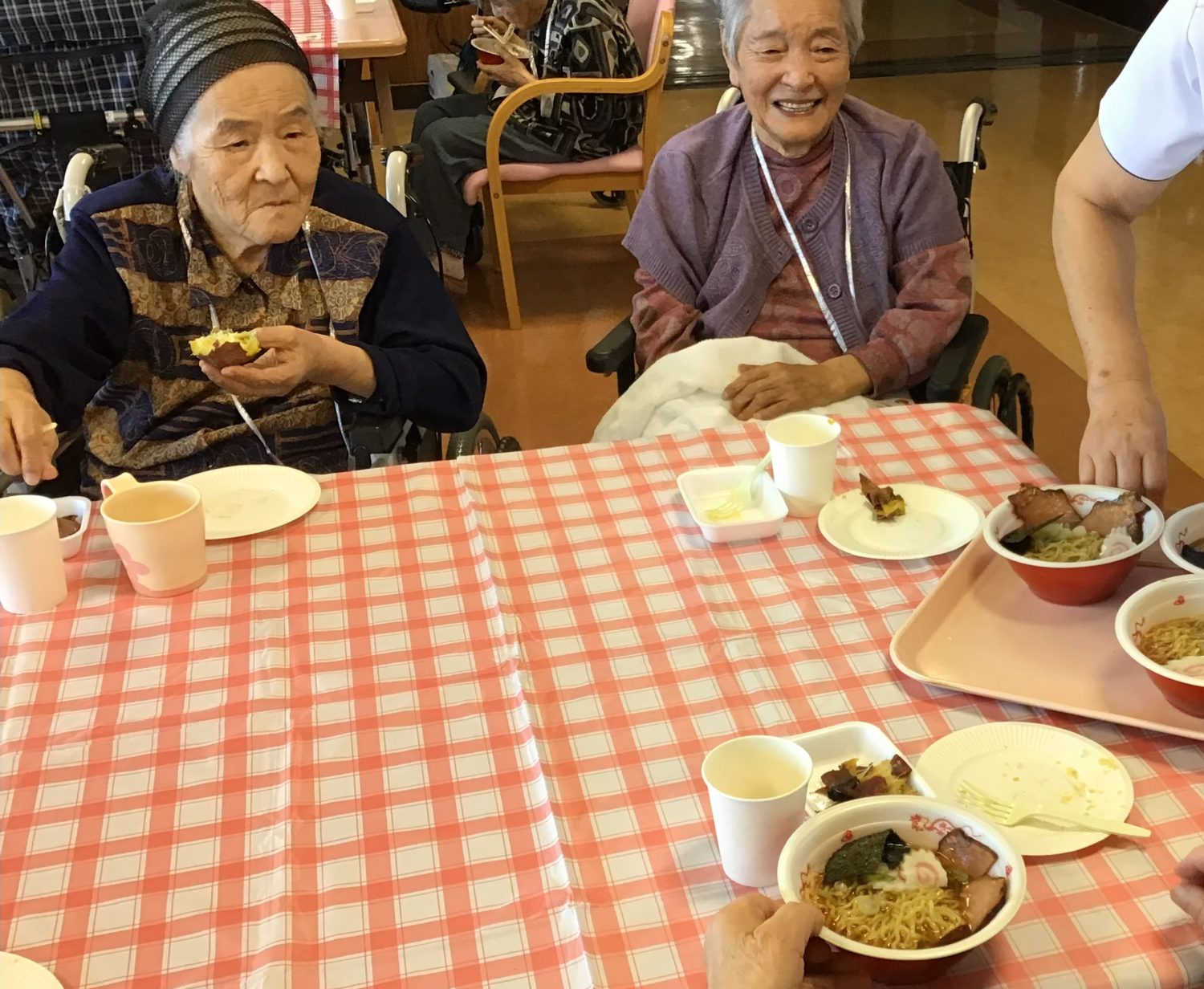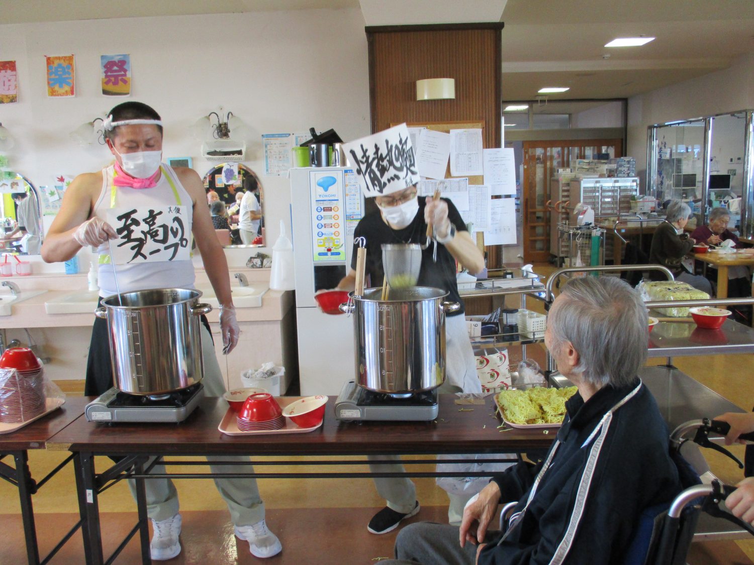 ラーメン屋さんに扮した職員が「ヨイショー!」の掛け声で元気に湯切り