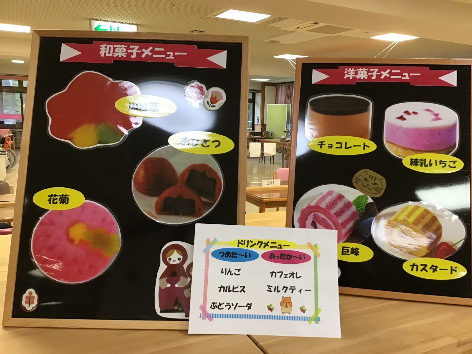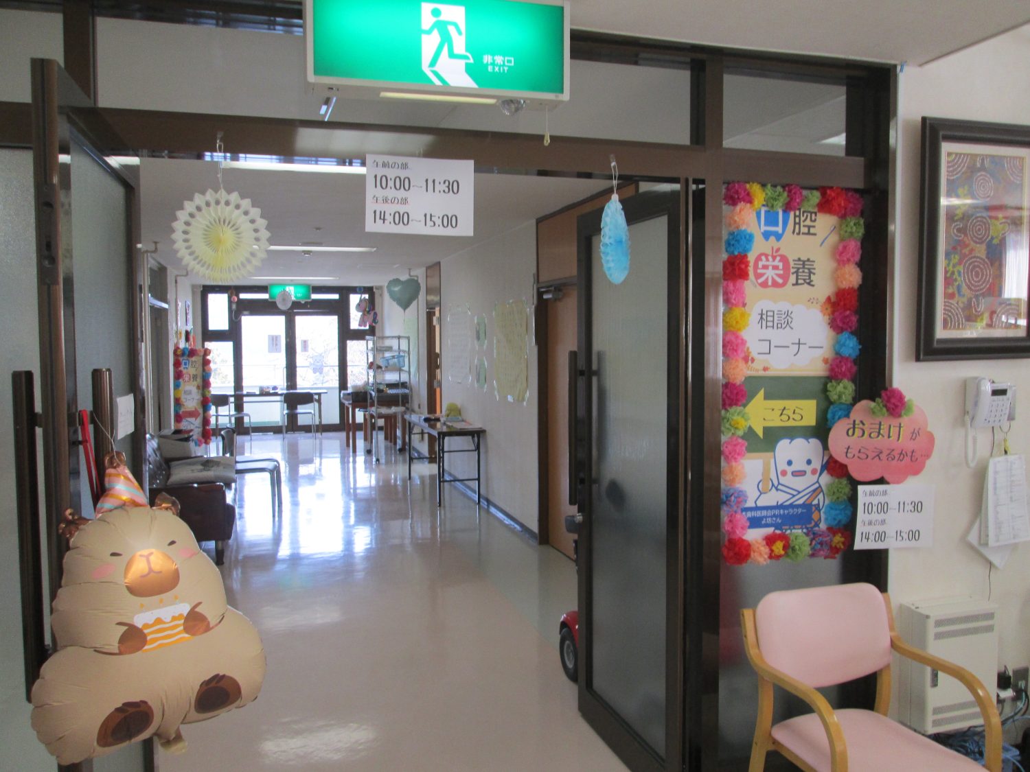 デイ・ケアセンターでは、毎月作成している壁画やぬりえの展示のほか、朋友館や星雲工房によるお菓子販売、福祉用具展示、また栄養課による口腔・栄養相談コーナーも設けられました。