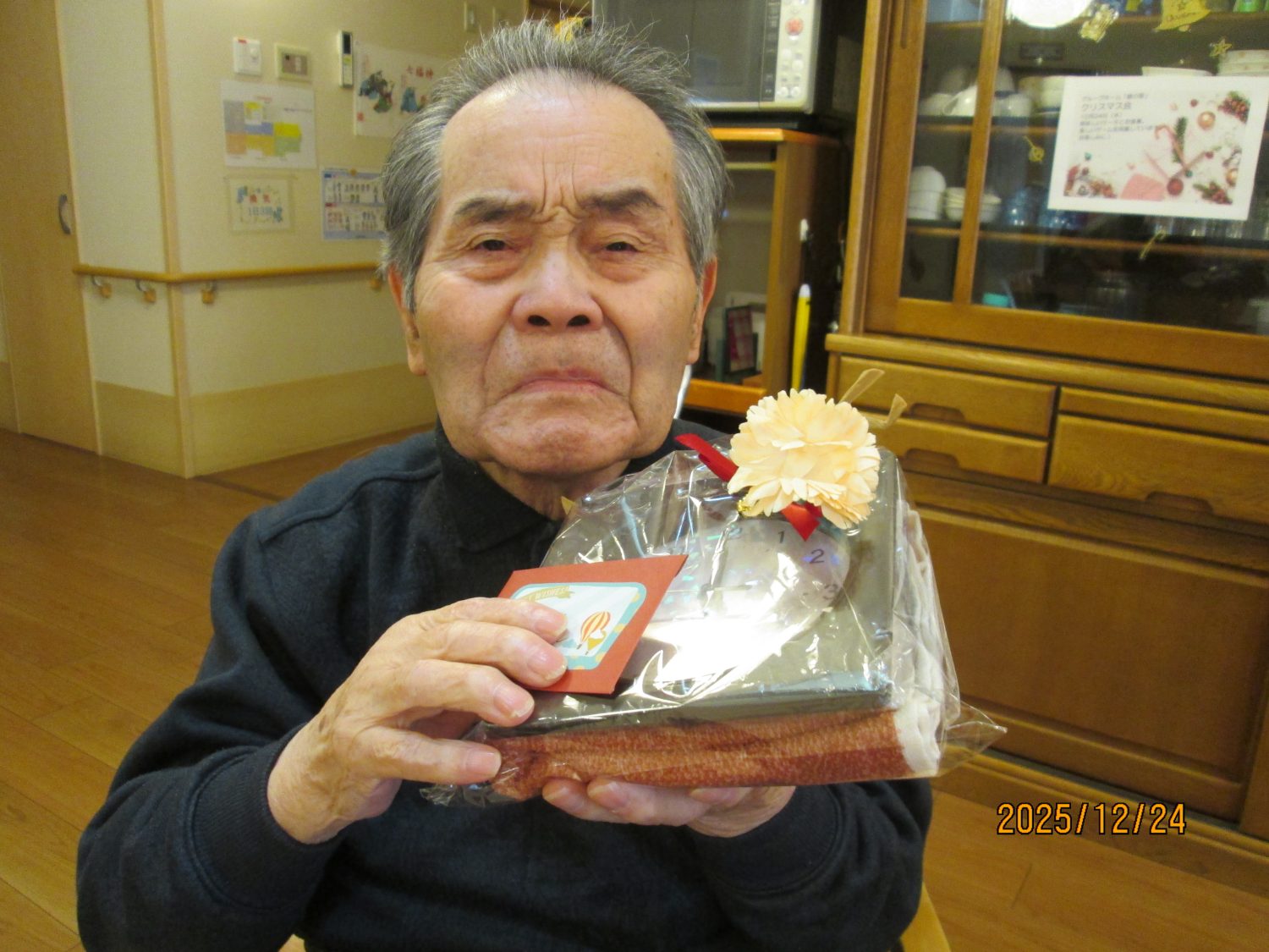 今年のプレゼントは壁掛け時計とタオルです。職員からのメッセージカードも添えて一人ひとり手渡していくと、涙ぐまれる方が続出…!喜んでもらえて私どももとても嬉しい気持ちになりました(^^) 当日不在だった方には後日プレゼントを渡させていただきました。