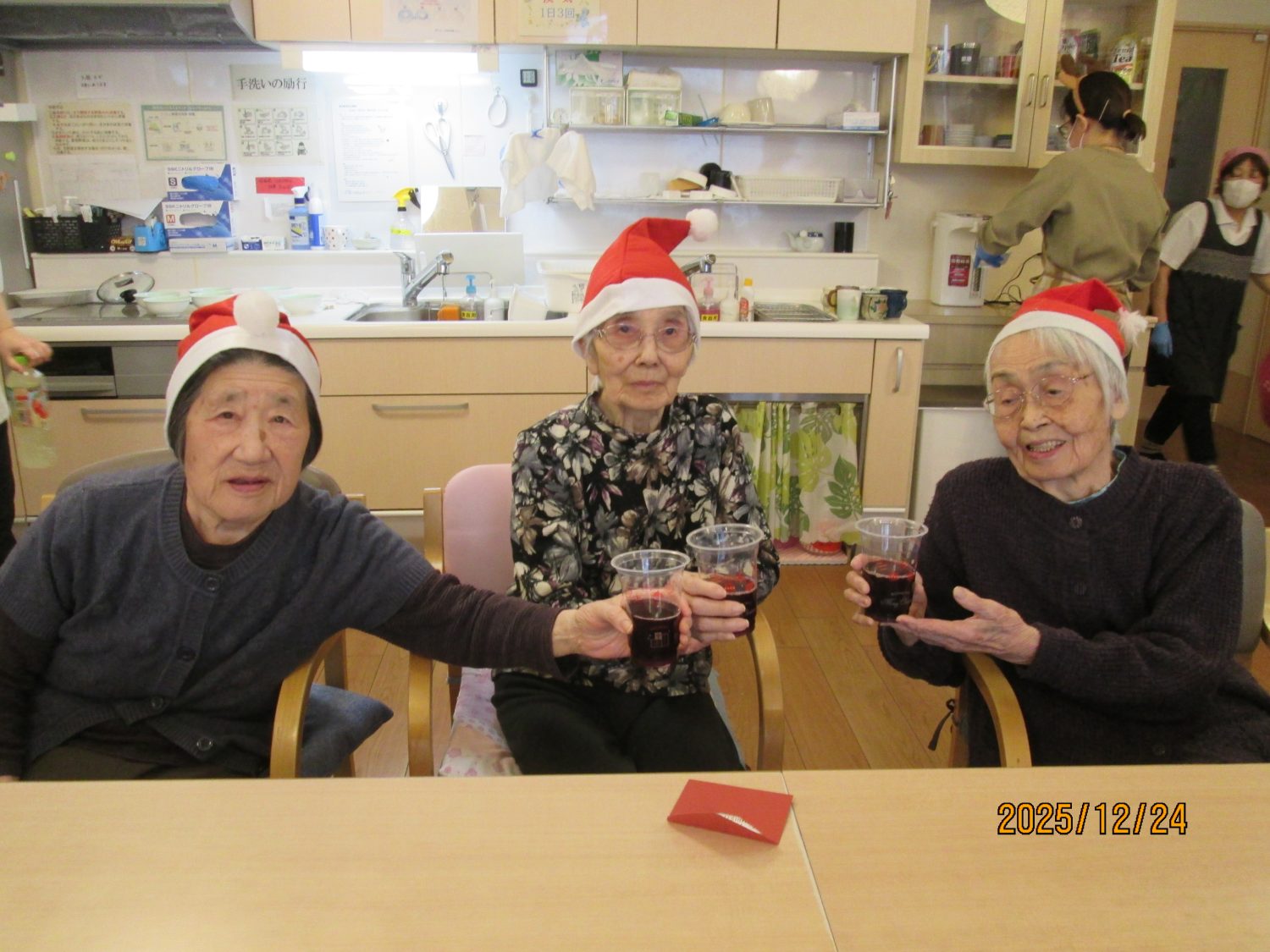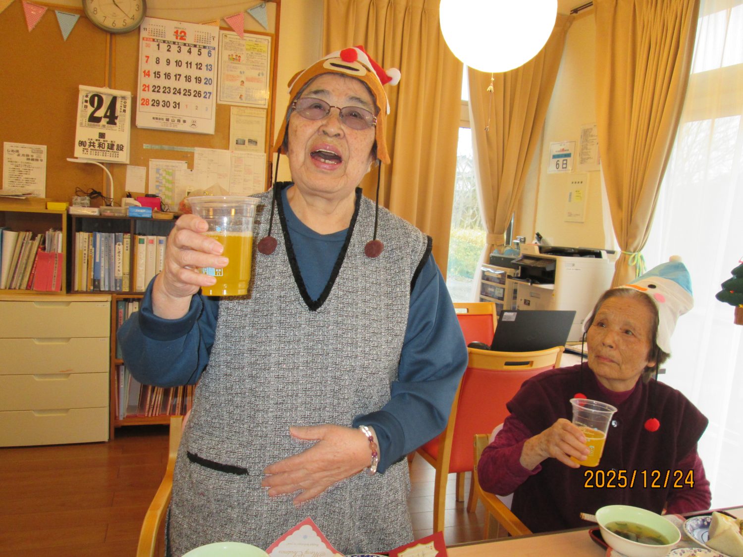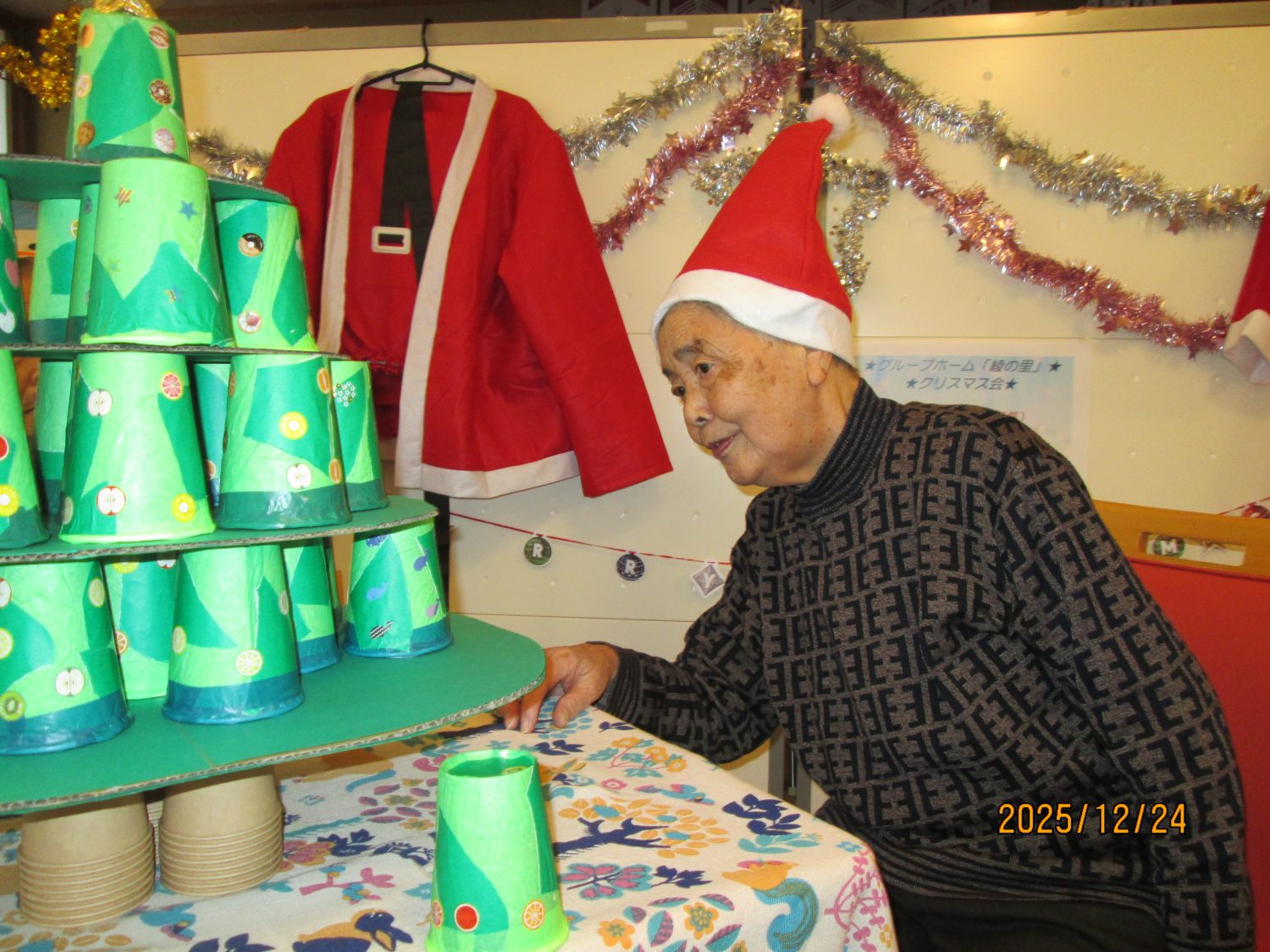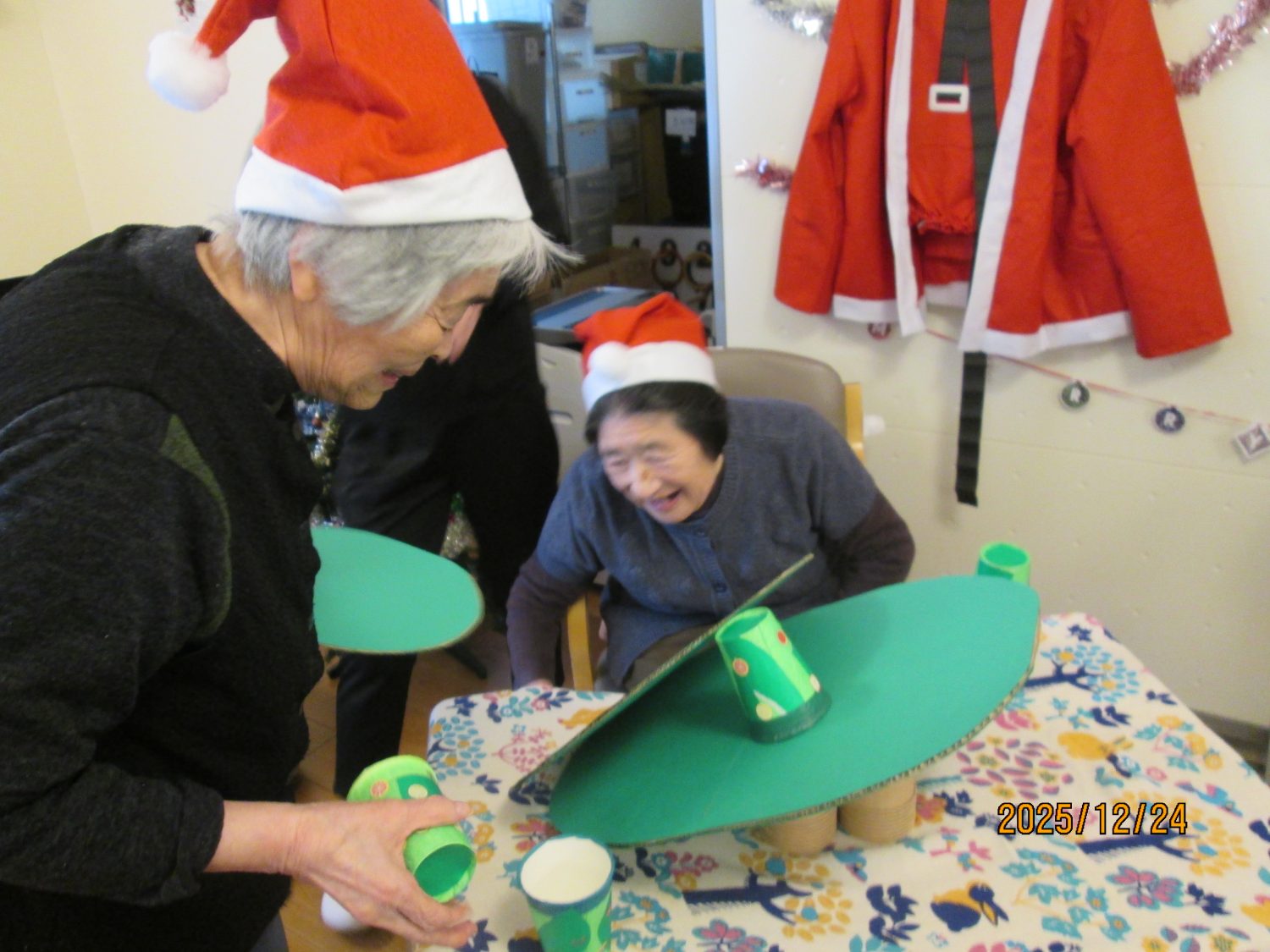 その後は懐かしのブドウ液で乾杯し、クリスマスメニューの昼食を食べ、紙コップクリスマスツリー倒し・箱の中身はなんだろな?ゲームで大盛り上がり!皆さん真剣すぎてなかなかツリーが倒れません…!さて倒してしまったのは誰でしょう?