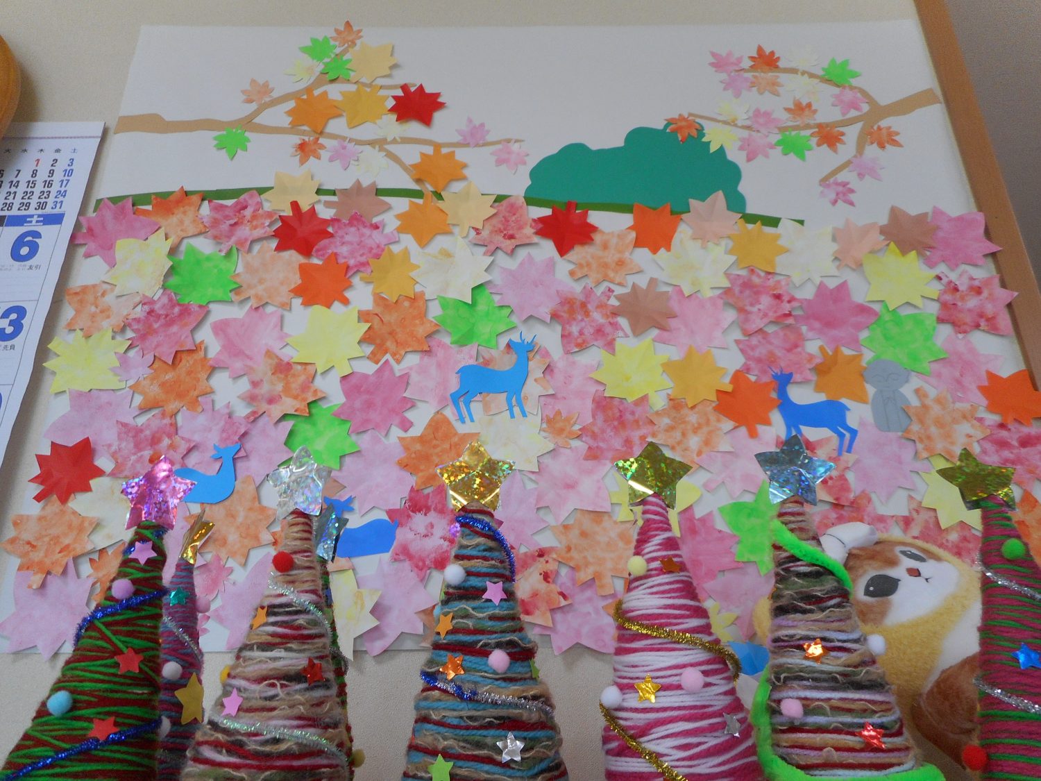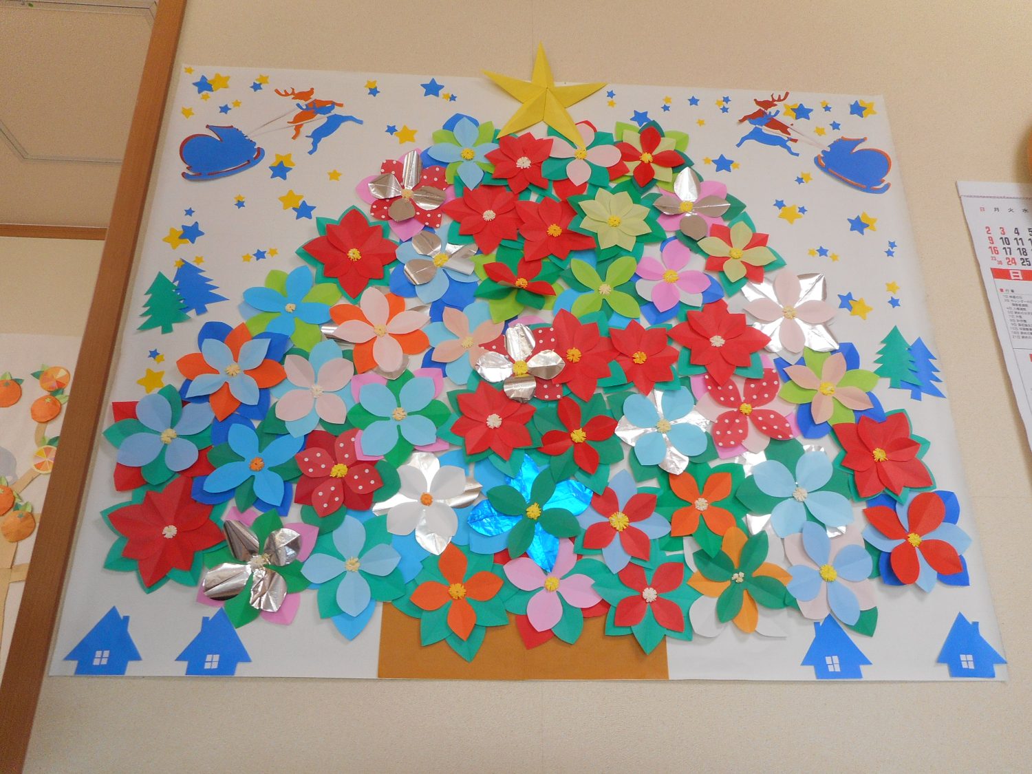 12月25日、26日にクリスマス会を行いました。ホールにはクリスマスツリー、利用者様が一つ一つ作ったポインセチアの花のツリーの壁紙や毛糸で作ったミニツリーが飾られ、クリスマスソングを歌ったり、カラオケをしたり楽しく過ごされました。おやつには手作りのイチゴのケーキを喜んで食べました。
