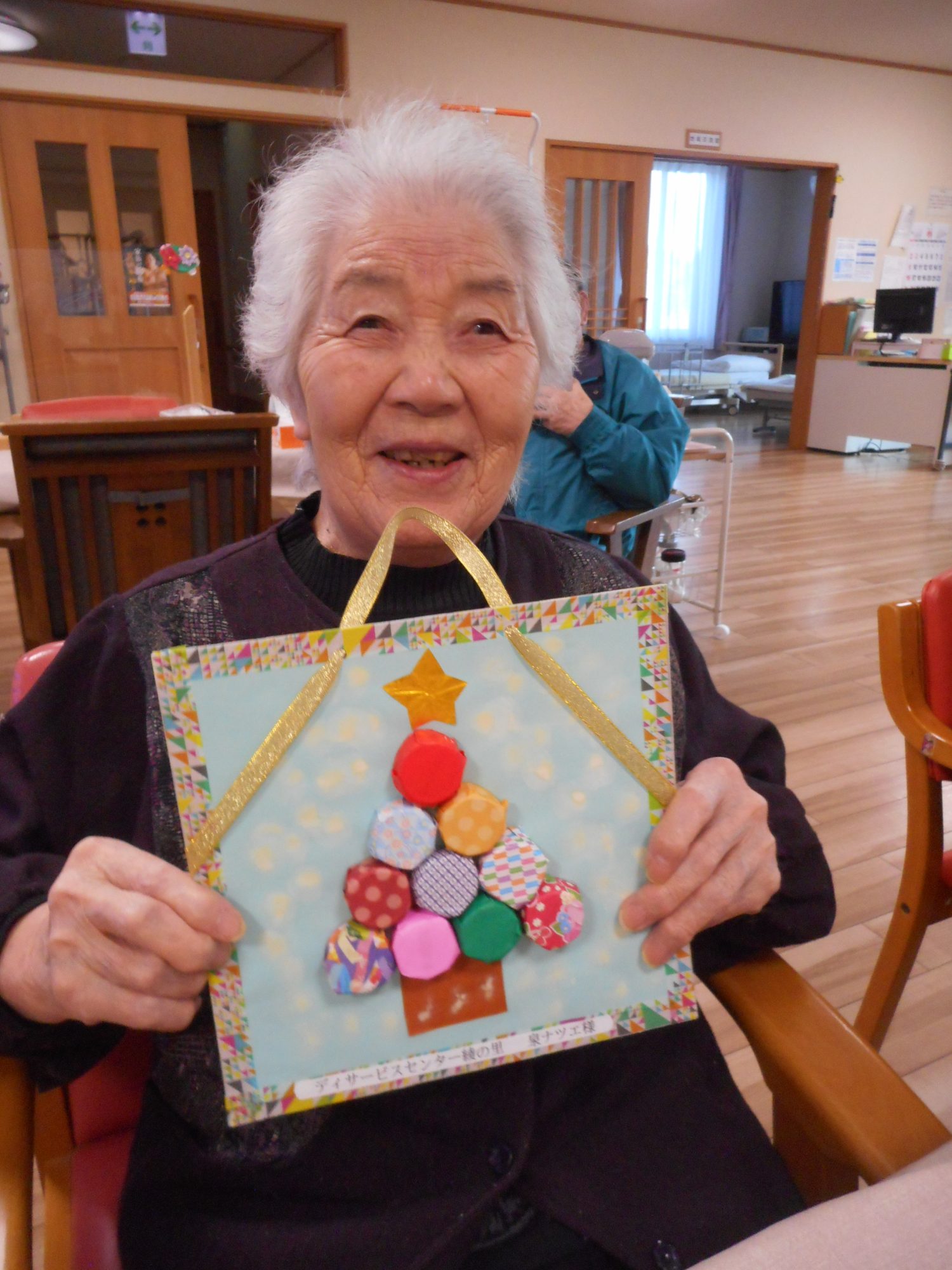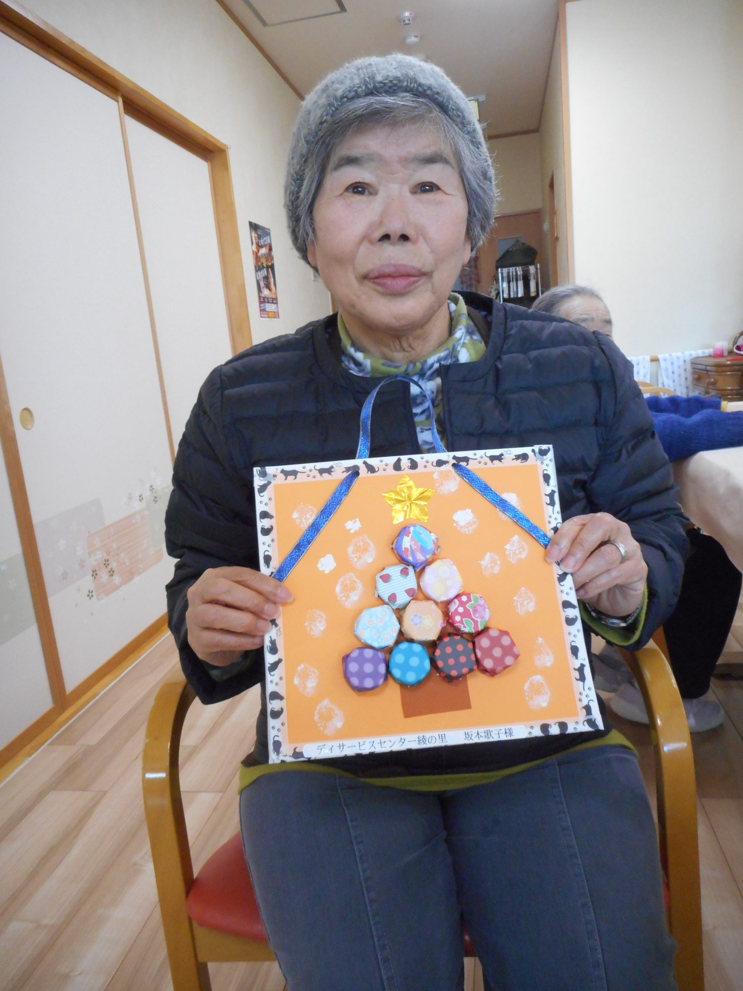 ペットボトルの蓋を折り紙で包む作業は少し難しかったですが、ご自分で色合いを考え、世界に一つだけのツリーの壁掛けが完成し、喜んでいました。