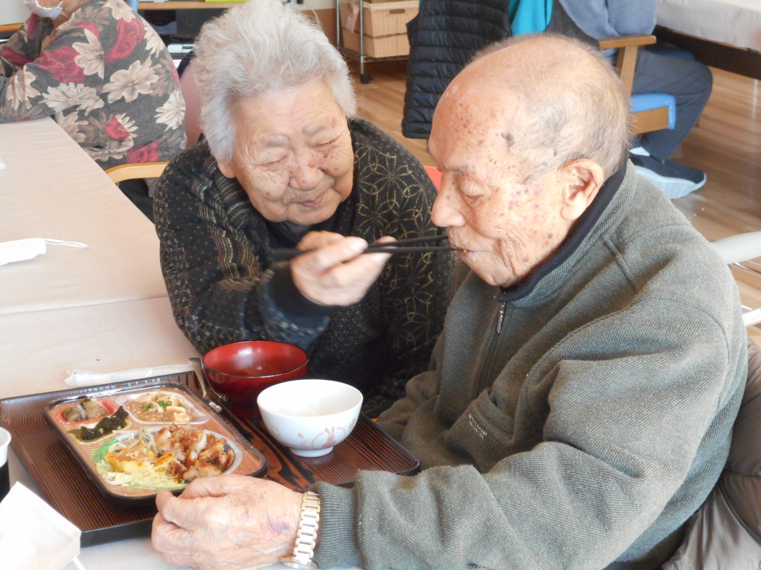 なかなか食べない102歳の旦那様に、「ほら たべらい」と食事介助する百歳の妻。